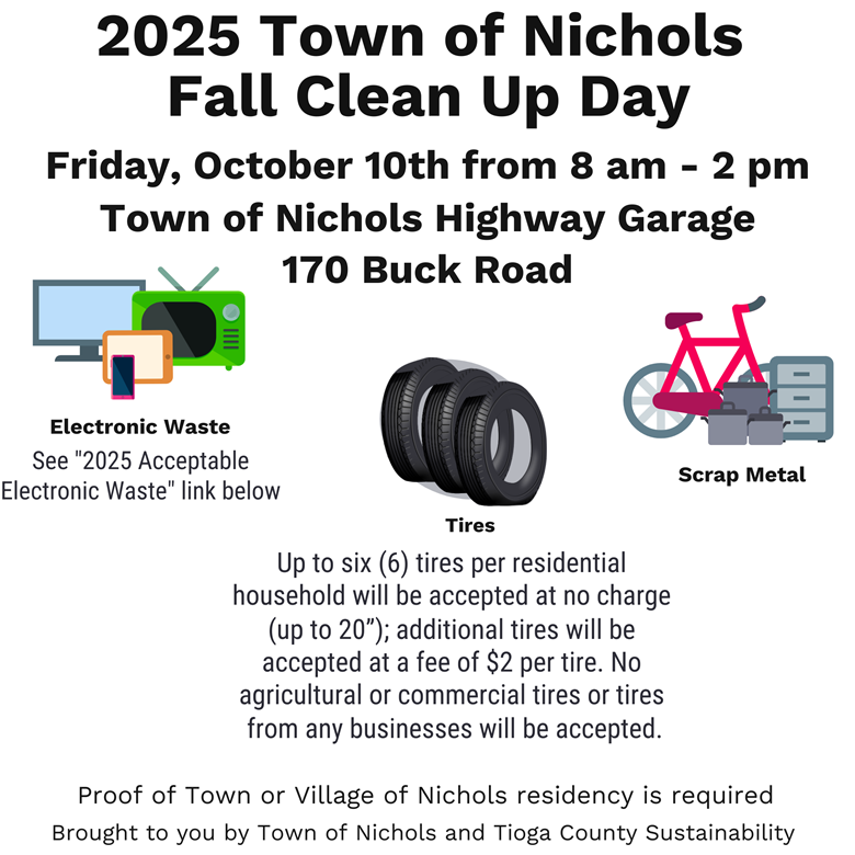 Many Tioga County municipalities have cleanup events that include electronic recycling. Check with your town to see if they include electronics during their cleanup event.